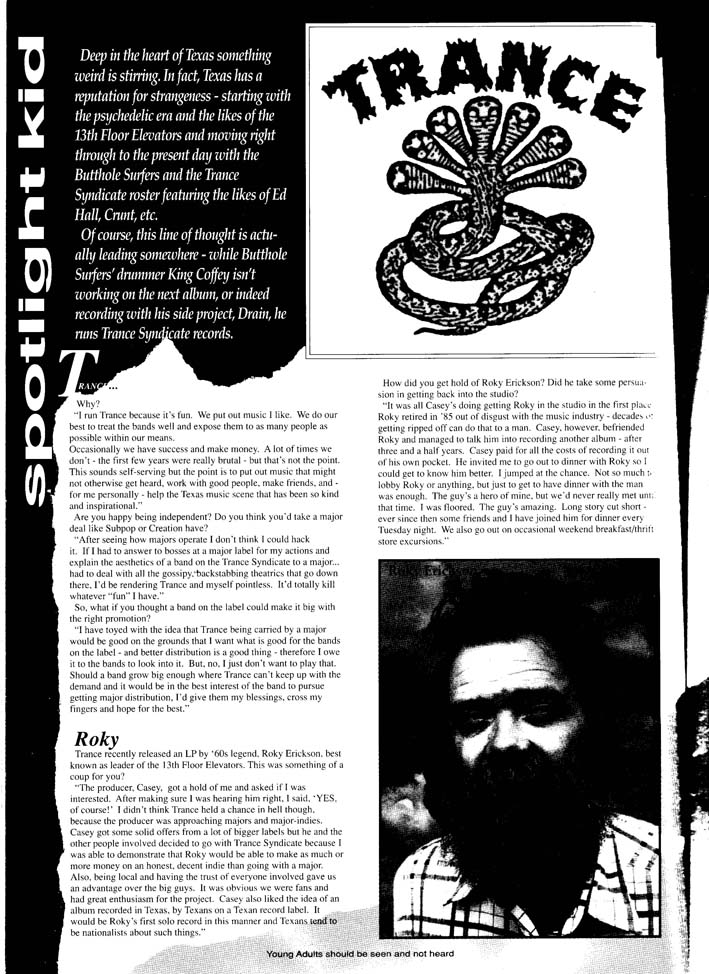 An A4 mag which existed for several years, SZS was conceived by members of Borders band Dawn of the Replicants. I did a few pieces for them towards the end of the magazine’s life (hmm, a pattern emerging here…) including the piece below on the Texas label Trance Syndicate.
